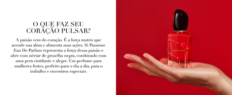 Depois de Sì Eau de Parfu, Sì Eau de Toilette e Sì Intense, Giorgio Armani lança no Brasil Sì Passione, a fragrância que traz um aroma intenso floral sensual e frutado, numa combinação marcante para uma mulher confiante, ousada e decidida – que se atreve a dizer sim. Ela diz Sì. Pelas palavras do próprio Giorgio Armani , “uma combinação irresistível de graça, força e independência de espírito.”